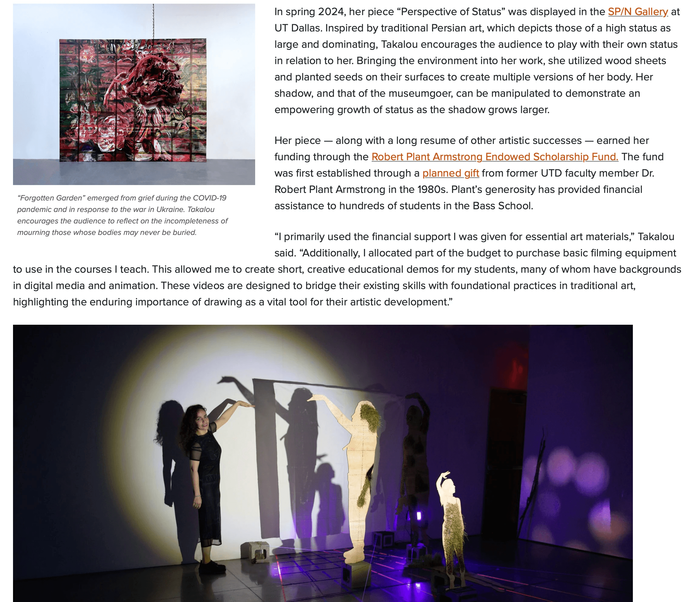 Takalou’s work has been featured in SIX Magazine (2021), VOA (2023), Dallas News (2023), Head Topics (2023), and more. Currently, she is pursuing her Ph.D. in Visual and Performing Arts at the University of Texas at Dallas, where she teaches courses on visual arts.